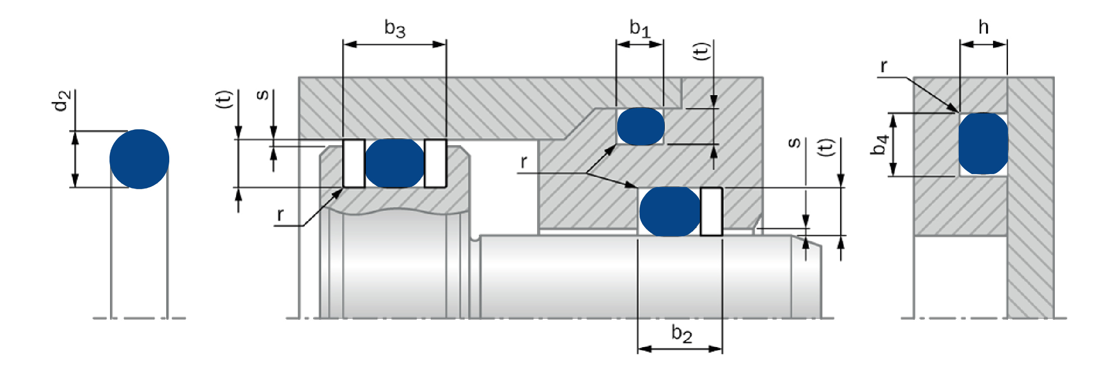 *2= I valori indicati per la profondità dell'alloggiamento si basano sulle dimensioni nominali della sezione trasversale dell'O-Ring. Il diametro interno dell'O-Ring e il suo allungamento non sono considerati. Larghezza della scanalatura b2 e b3: quando si utilizzano anelli di sicurezza, la scanalatura deve essere allargata dello spessore dell'anello di sicurezza corrispondente (b2: un anello di sicurezza, b3: due anelli di sicurezza).